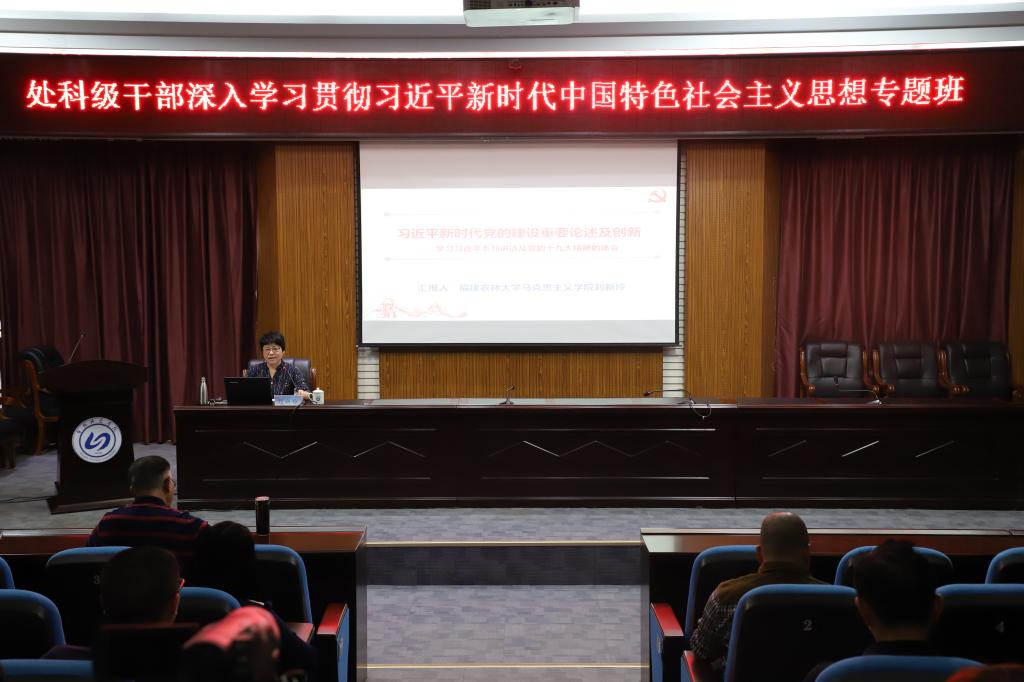 10月26日下午,我校处科级干部深入学习贯彻习近平新时代中国特色社会主义思想专题班第三讲如期举行,福建农林大学马克思主义学院院长刘新玲作题为《习近平新时代党的建设重要论述及创新----学习习近平系列讲话及党的十九大精神的体会》专题讲座。